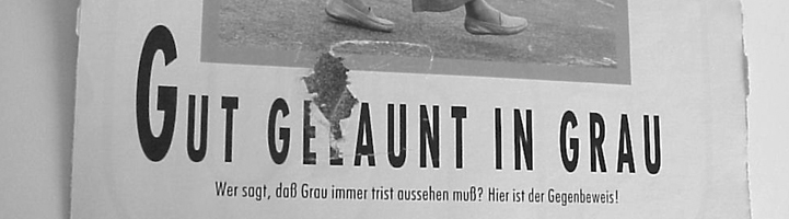 | At 20 I started going grey up top. Is it just a lack of melanin? Back in Boston, the University Medical Research Centre discovered that individuals who start to grey while still young are six times more likely to suffer a degenerative thinning of the bones. “Let the grey ones beware! The general public no longer loves its grey ones so dearly” warned D.H. Lawrence. Smokers are four times more likely to begin greying prematurely. Will the woman in my life like my grey hair? I contacted the Cologne branch of The Grey Panthers. Prevent grey hairs with our special stress-free mortgage for first time buyers. The pensioners I jog past don’t look like roaring. There are over one thousand pensioners in UK jails. My legs ache, each stain on the grey path a little grey country. A meeting of The Grey Council is adjourning. Grey cloaks stand around a circular table. I proposed hiring a Miro exhibition to contrast my Payne’s Grey suite of Kilmarnock paintings. I moved to the grey town of Derby and read James Hanley’s Grey Children – a study in humbug and misery. I moved to Liverpool. When skies are grey asked Steve McManaman whether his favourite colour was red or blue. “Neither” he diplomatically replied, “it’s grey.” Grey is a colour with a gentle demeanor, perfect for autumn, winter and spring, a colour for the business world, serious and respected. |