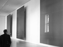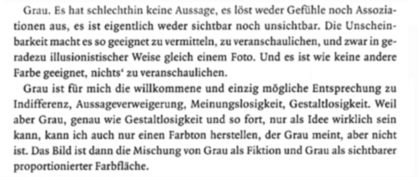 | Unlike Robert Rauschenberg who limited perception to the shadow of the viewer moving in front of the white canvas, Gerhard Richter removed even the shadow itself. He wrote to Edy de Wilde in 1975 grey is the epitome of non-statement, it does not trigger off feelings or associations, it is actually neither visible nor invisible … and like no other colour it is suitable for illustrating ‘nothing’. It is the only possible equivalent for indifference, for the refusal to make a statement, for lack of opinion, for lack of form. |